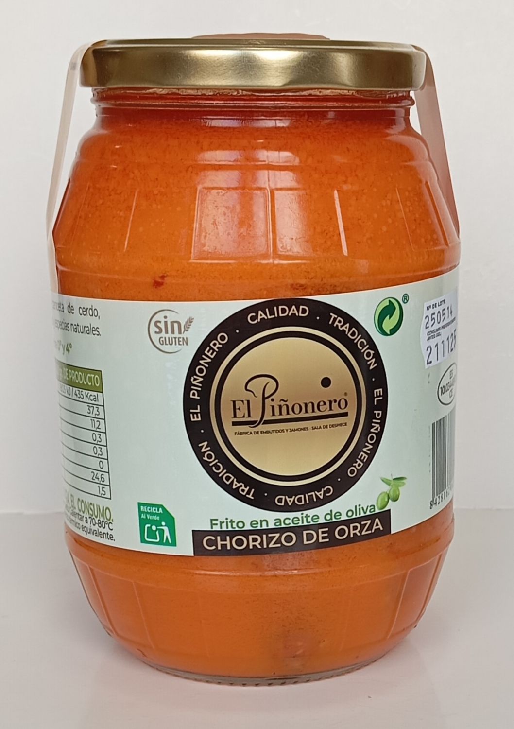 Chorizos fritos en Aceite de Oliva y Conservadas en Orza. Al estilo Artesano y tradicional Manchego. Sin Aditivos, ni conservantes.Primero se secan los Chorizos, se prepara el aceite de oliva y se frien de forma artesanal. Se conservan en las tradicionales orzas de Castilla la Mancha y quedan listas para abrir y degustar. Especial como tapa, segundo plato o para acompañar con una guarnición (arroz, alubias, garbanzos...) y hacerlo plato único. |