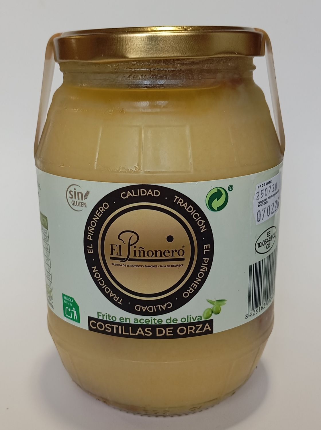 Costillas de cerdo fritas en Aceite de Oliva y Conservadas en Orza. Al estilo Artesano y tradicional Manchego. Sin Aditivos, ni conservantes.Primero se adoban las costillas de cerdo, se prepara el aceite de oliva y se frien de forma artesanal. Se conservan en las tradicionales orzas y quedan listas para abrir y degustar. Especial como tapa, segundo plato o para acompañar con una guarnición (arroz, alubias, garbanzos...) y hacerlo plato único. |