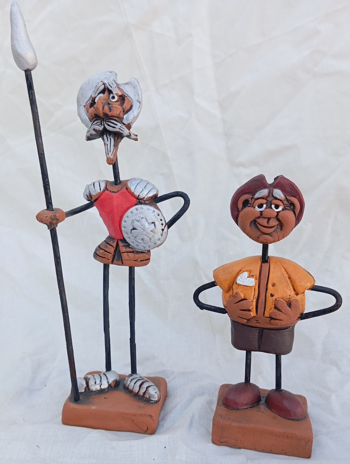 Figura de cerámica artesana que representa a D. Quijote y Sancho panza en tamaño pequeño, altura aproximada 26 cm. para D. Quijote y 17 cm. para Sancho |
