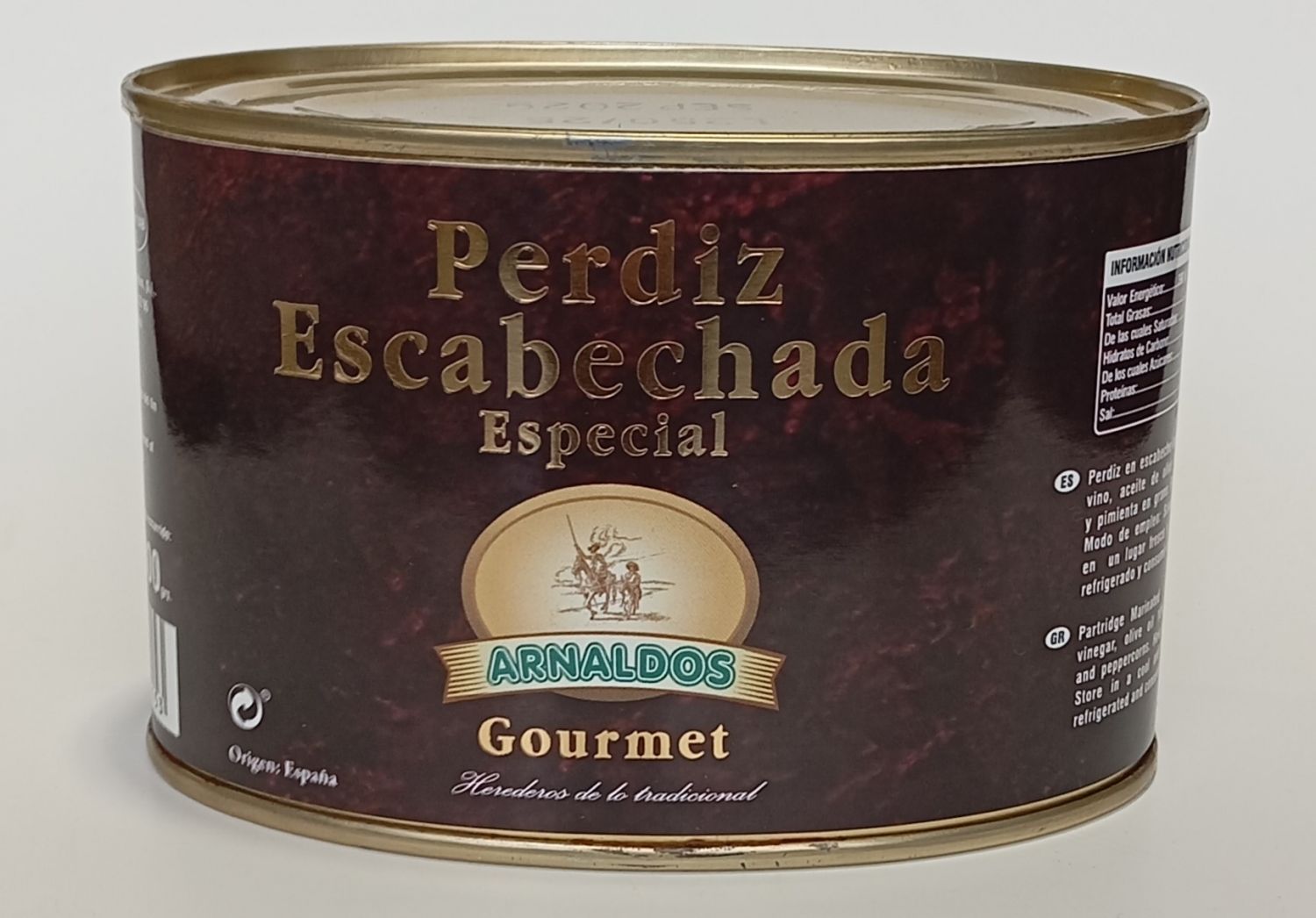 Perdiz Roja de Campo en Conserva de Escabeche. Lata de 0.55 Kg. Peso Neto. Plato Preparado de Perdiz de Campo, en la Tradicional Conserva Manchega de Escabeche. Alimentación de Castilla la Mancha.Modo de empleo: Producto Manchego, que se sirve frío, del tiempo o calentado ligeramente. El contenido se conserva apto para su consumo hasta 4 años después de su fecha de fabricación. Conserva Artesana y Natural, Sin aditivos, ni conservantes. |